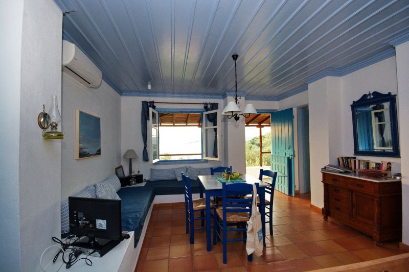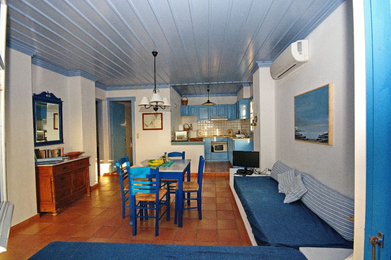 From the terrace, a stable door leads into the air-conditioned lounge with its traditional blue and white furnishings and 2 built-in sofas (which could easily sleep a child or two).