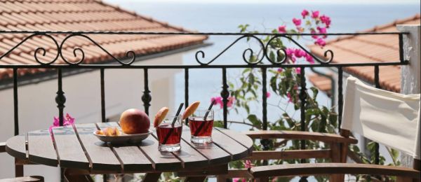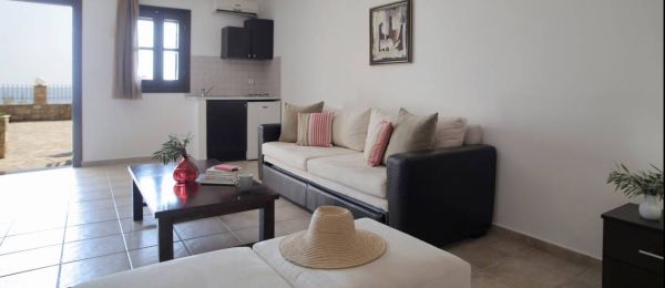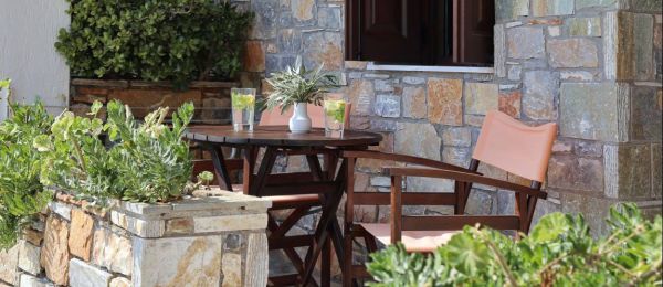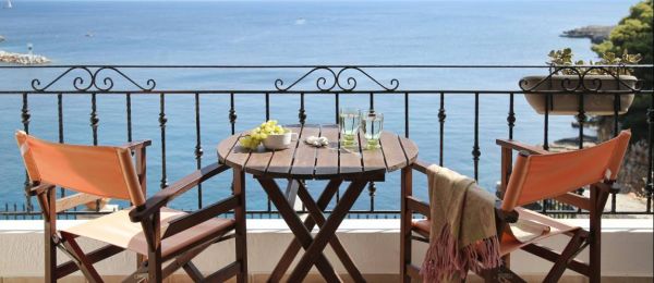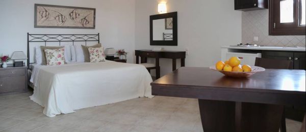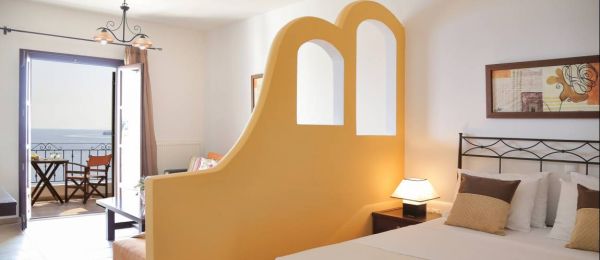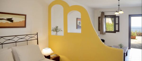 The most impressive views are acquired from the two Superior Suites, situated on the floor above the reception area. The large private balconies look out onto the shimmering Aegean.