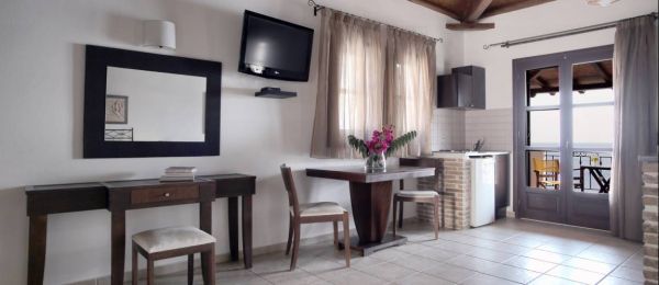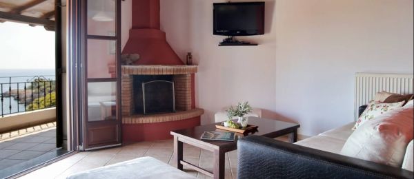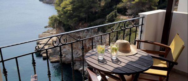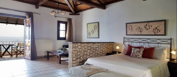All rooms are spacious (35-45 sqm) with sea-facing balconies or terraces overlooking “Ta Dio Adelphia” islands and beyond.